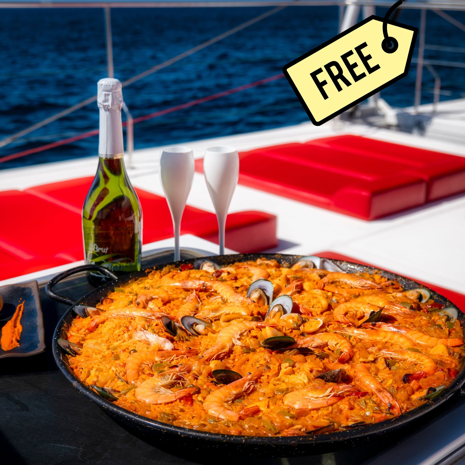 🍹 Servicio Todo Incluido: Disfruta de bebidas de cortesía, incluyendo cava, cerveza y refrescos, junto con una deliciosa paella de mariscos servida a bordo.